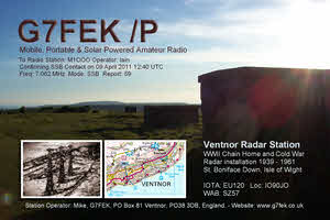 I am also operating on battery portable / solar power from a high up location near the Ventnor WWII Radar installation. I will be pleased to exchange qsl cards with anyone I make contact with, if they have sent a direct qsl to the PO box address on my QRZ page.